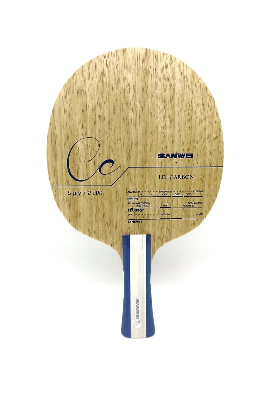 Featuring a 5-ply wood and 2-ply carbon (5W+2C) composition, the Sanwei CC Carbon incorporates inner LD Carbon layers (Lightweight Durable Carbon) placed close to the core. This design enhances dwell time and ball feel, distinguishing it from harsher outer carbon blades.